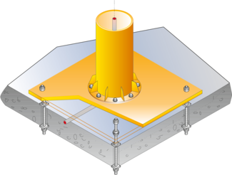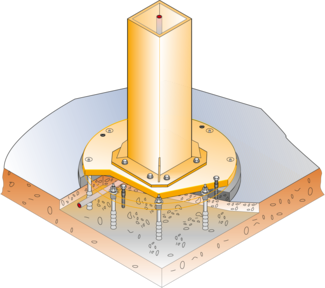 La fijación con una placa intermedia cuadrada es una solución adecuada. La placa base se perfora con un taladro de barrena sacanúcleos con escopleado final de la parte inferior para que, tras el vertido, los anclajes insertados cuenten con un buen anclaje contra extracción.
