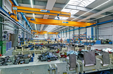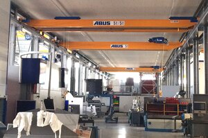 Las grúas consola (o ménsula) monorraíles de ABUS se mueven en su propio nivel por debajo de los grandes puentes grúa. El flujo de materiales se acelera con la ampliación de las posibilidades de transporte en otros ámbitos de la producción.
