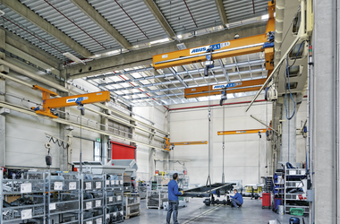 Son ideales para atender varios puestos de trabajo al mismo tiempo. La grúa consola monorraíl ABUS se suministra con capacidades de hasta 5 t y longitudes de brazo de hasta 12 m.