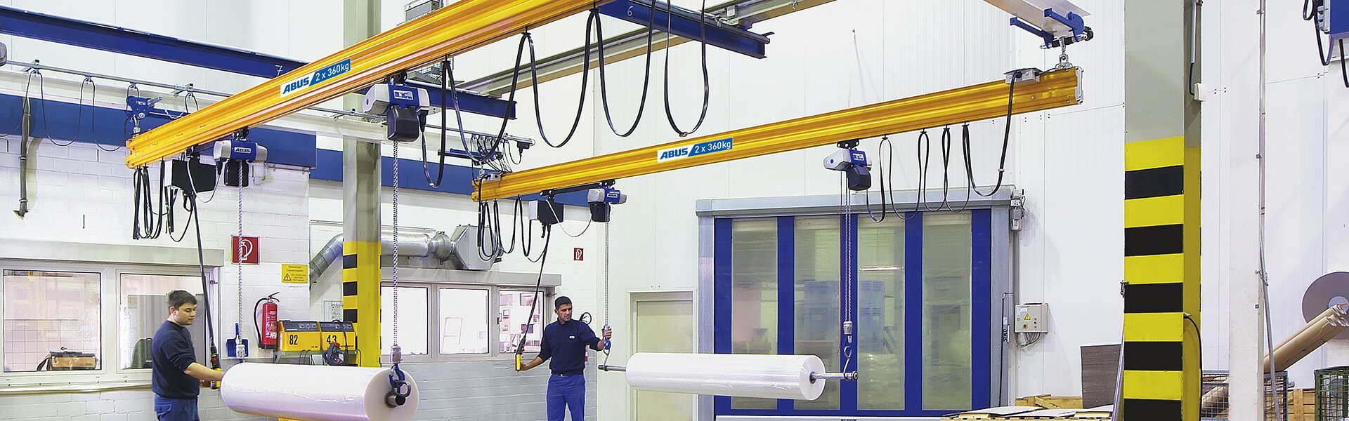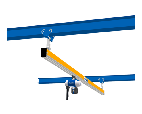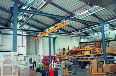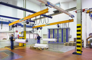 La grúa monorraíl EHB-I de ABUS es una buena solución para el transporte de materiales en toda la superficie de la nave cuando hay perfiles laminados a la distancia de la luz de la grúa. El puente de perfil ligero se desplaza suspendido directamente de los carriles de perfil laminado.
