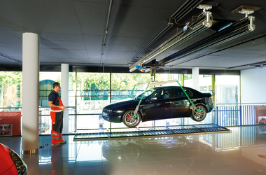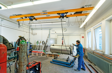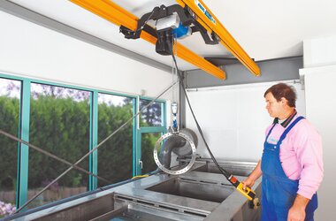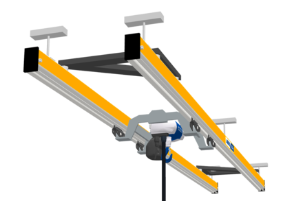 La ventaja de la línea birraíl de ABUS es la mayor distancia entre suspensiones y una mayor altura del gancho gracias a la especial colocación del polipasto eléctrico de cadena ABUS.