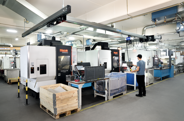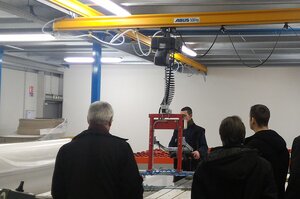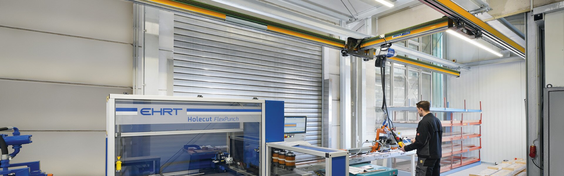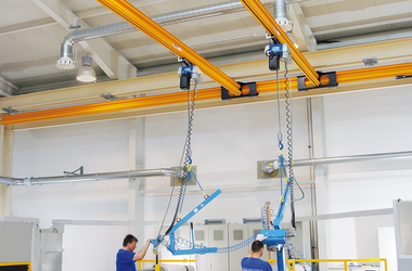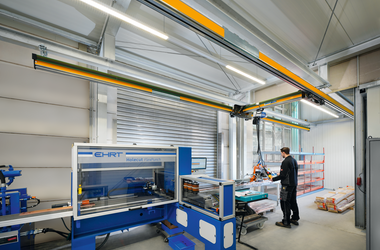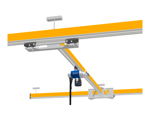 Cuando la altura de construcción del EHB no es suficiente, la solución está en la grúa EHB-X. Con esta grúa puente monorraíl, la viga de la grúa no se traslada por encima sino directamente entre los carriles de grúa, de manera que la altura de la grúa se reduce a la de un único perfil. Así se alcanza una altura de elevación claramente mayor, capaz de superar por ejemplo máquinas de gran altura en la zona de desplazamiento.