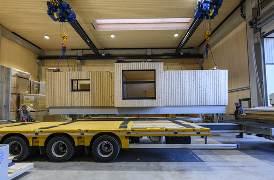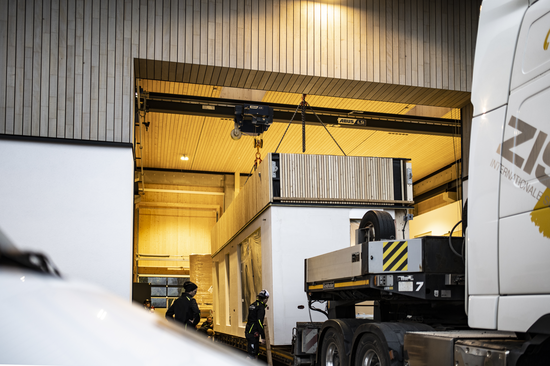 La rapidez y la precisión son esenciales para la empresa, en particular a la hora de cargar los camiones con las piezas acabadas de las casas modulares. Anteriormente se utilizaban dos grúas móviles para la operación de carga, lo que obligaba a instalar los módulos al aire libre en lugar de en la nave. Por ello, Meisterbau Aichinger invirtió en nuevas grúas para su producción: estas nuevas grúas no sólo ayudan a optimizar el proceso, sino que también permiten cargar las casas modulares terminadas en la nave de nueva construcción. Meisterbau Aichinger GmbH se decidió por dos puentes grúa siguiendo el consejo del Ing. Klaus Schneider GmbH, socio de ABUS Kran Austria. El proceso de carga se aceleró y el esfuerzo se redujo significativamente utilizando estos dos puentes grúa ABUS, que también pueden funcionar en tándem.